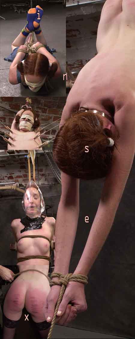 After her interview, she is maneuvered down to the ground with legs tied together and arms behind her back. Hogtied tightly, she wiggles on the cold concrete floor.